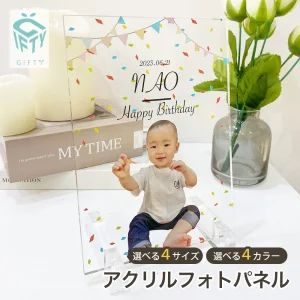 お子様の写真と名前、選択肢を表す使えるアクリルパネル。