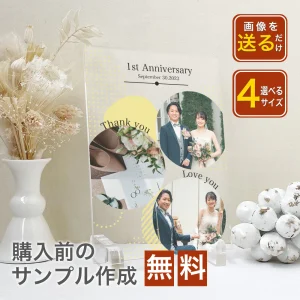 お写真3枚とメッセージを組み合わせて使えるアクリルパネル。 シンプルでありながらどこに飾っても可愛いアクリルパネルは当店の人気商品です。 セットでアクリルのスタンドが付属しております。